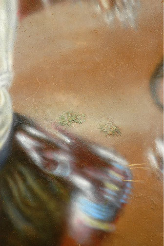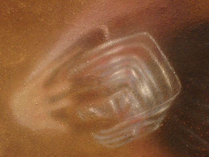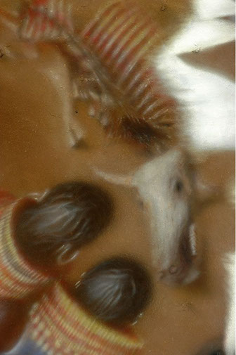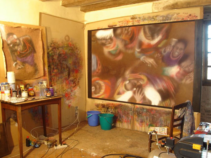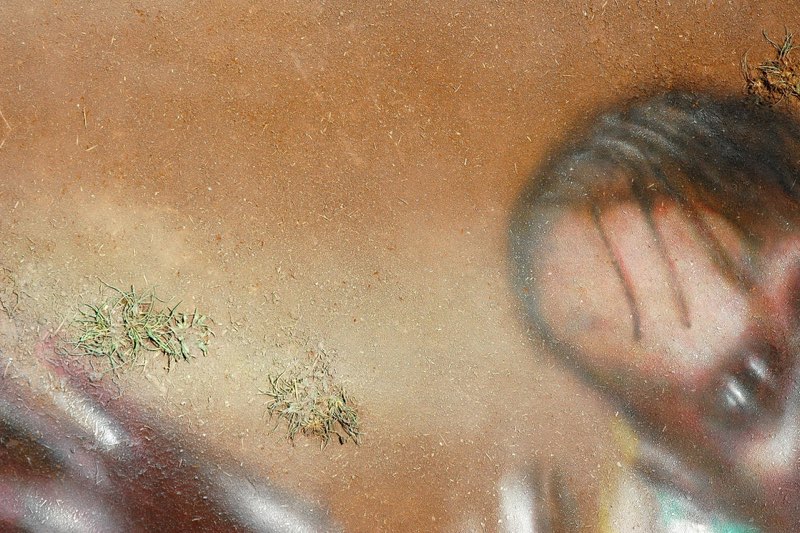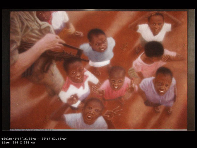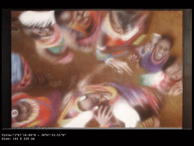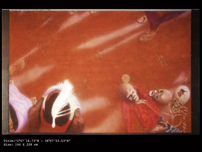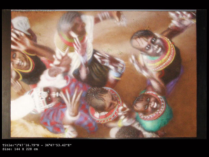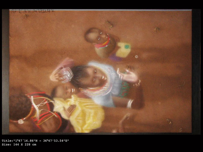 Work created when I was living with the Turkana tribe in the north of Kenya. This work is a reaction against the cold and objective representation of our planet depicted by Google Earth and the voyeuristic images from satellites and security cameras that invades us. I replaced the pixel by the grain of earth directly taken from the ground and painted on it the people I was living with.