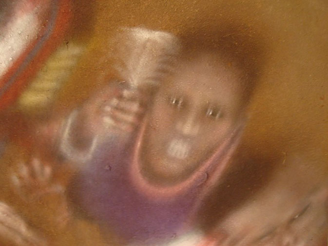 Work created when I was living with the Turkana tribe in the north of Kenya. This work is a reaction against the cold and objective representation of our planet depicted by Google Earth and the voyeuristic images from satellites and security cameras that invades us. I replaced the pixel by the grain of earth directly taken from the ground and painted on it the people I was living with.
